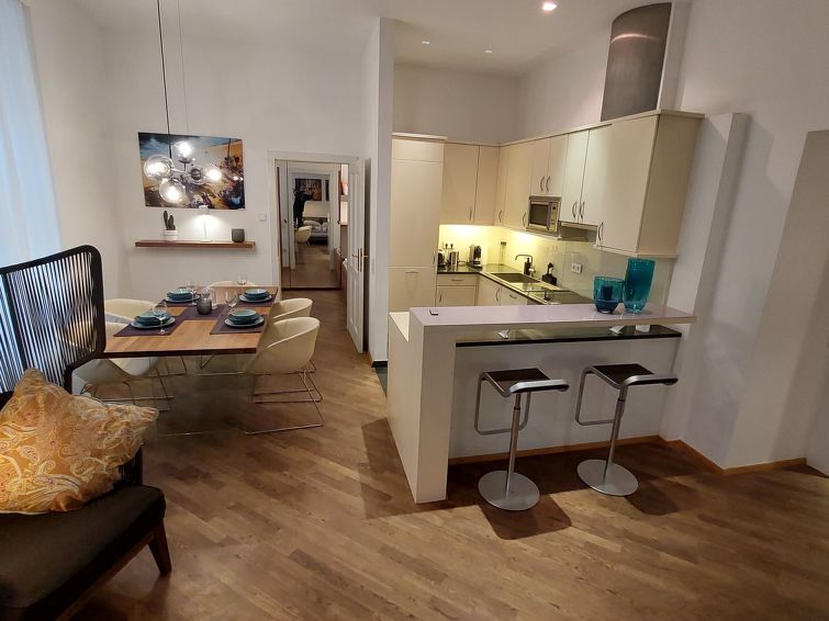 Apt 2 pièces 70 m2 au 3ème étage. Aménagement très moderne et de style: entrée. Séjour/salle à manger avec 1 lit gigogne (2 pers. 2 x 80 cm, longueur 200 cm), table pour les repas et écran plat. 1 chambre double avec ventilateur. Cuisine ouverte (four, lave-vaisselle, 4 plaques vitrocéramiques, grille-pain, bouilloire électrique, micro-ondes, congélateur, cafetière électrique, Capsules pour machine à café (Nespresso)) avec petite bar. Douche/WC. Sol en parquet. A disposition: lave-linge, fer à repasser, sèche-cheveux. Internet (Connexion WIFI, gratuit). Veuillez noter: logement non-fumeur. L'appartement de ville est de haute qualité avec du mobilier choisi avec goût.