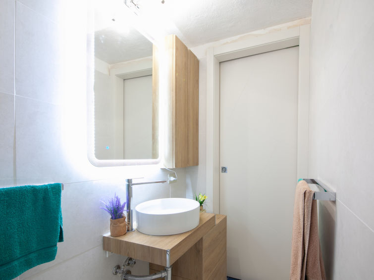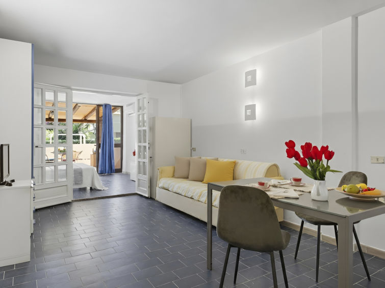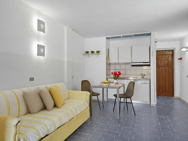"La Marina", apt 2 pièces 36 m2, au rez-de-chaussée. Aménagement simple: séjour/salle à manger avec TV (satellite) (écran plat). 1 chambre double avec TV (écran plat). Cuisine ouverte (4 plaques de cuisson, grille-pain, bouilloire électrique). Douche/bidet/WC. Pas de chauffage. Grande terrasse 34 m2 partiellement. Meubles de terrasse, chaises longues, place pour s'asseoir. A disposition: lave-linge, fer à repasser, sèche-cheveux. Veuillez noter: réfrigérateur sans compartiment congélateur. : IT090006C2000T9334