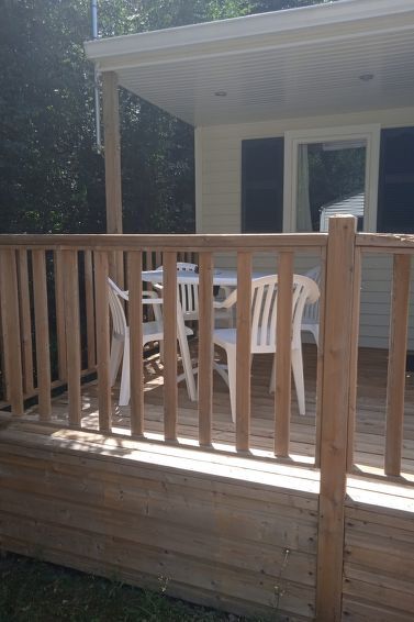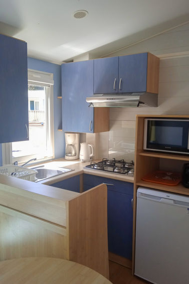 3-kamers mobilhome 25 m2. Doelmatig ingericht: woon-/slaapkamer met 1 slaapplaats en TV (Flatscreen TV). 1 kamer met 1 2-pers bed (1 x 140 cm, lengte 190 cm). 1 kamer met 2 bedden (80 cm, lengte 190 cm). Kookhoek (4-pits kookplaat, broodrooster, waterkoker, magnetron, elektrische koffiemachine). Douche, aparte WC. Elektrische verwarming. Terras. Terrasmeubelen. Maximaal 2 huisdieren/honden toegestaan. Rookmelders. Aanbod door een commerciële eigenaar volgens art. 155, IV, CGI